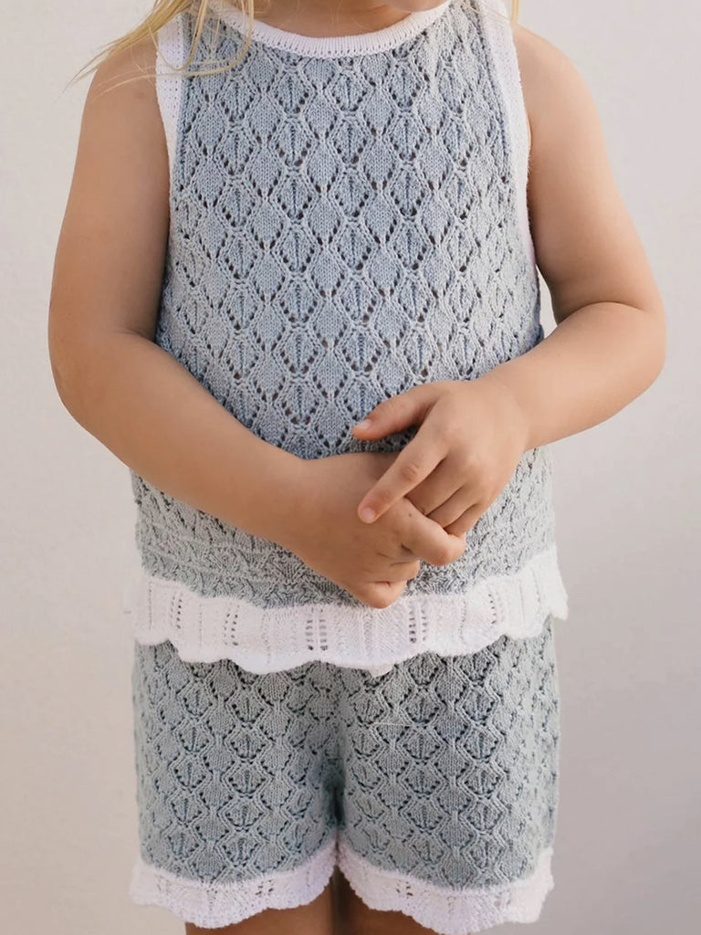 The Bella Knit Shorts are the perfect blend of comfort and charm. Featuring a delicate pointelle design in a dreamy powder blue, they’re finished with scalloped hems and a contrast white waistband for a vintage-inspired touch. Soft, stretchy and oh-so-cute, these are made for twirling, toddling, and everything in between.