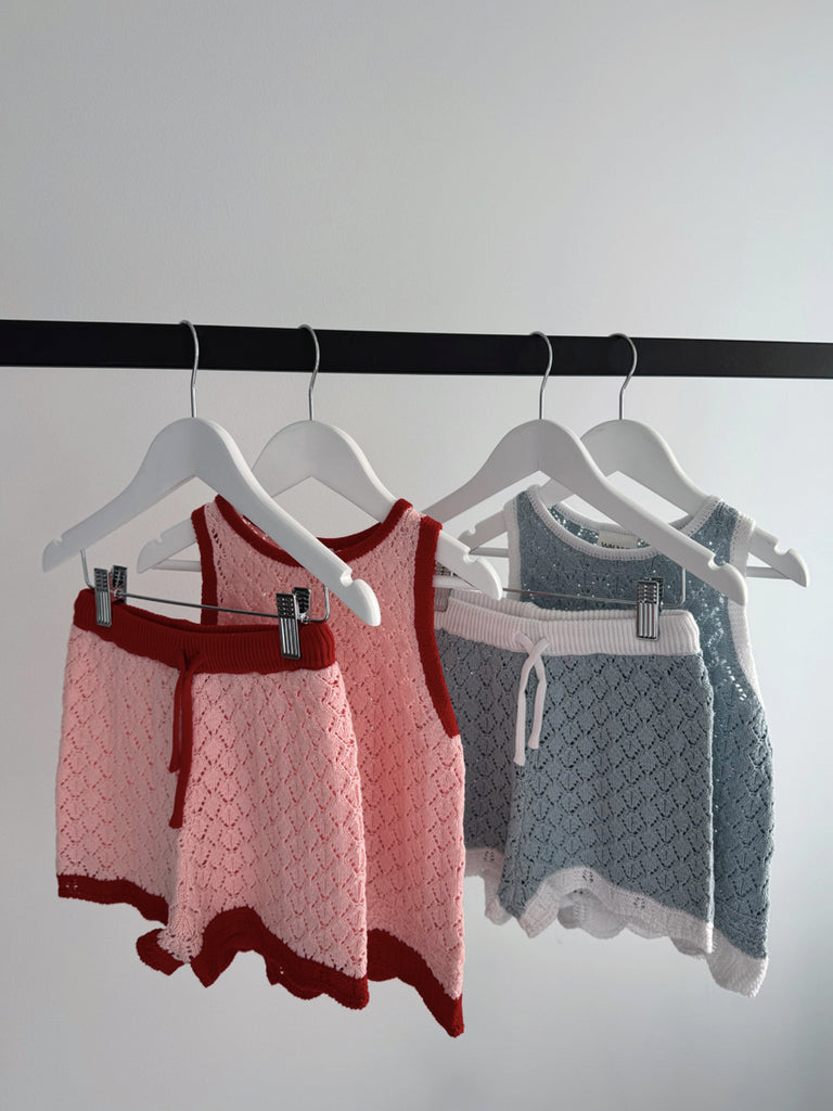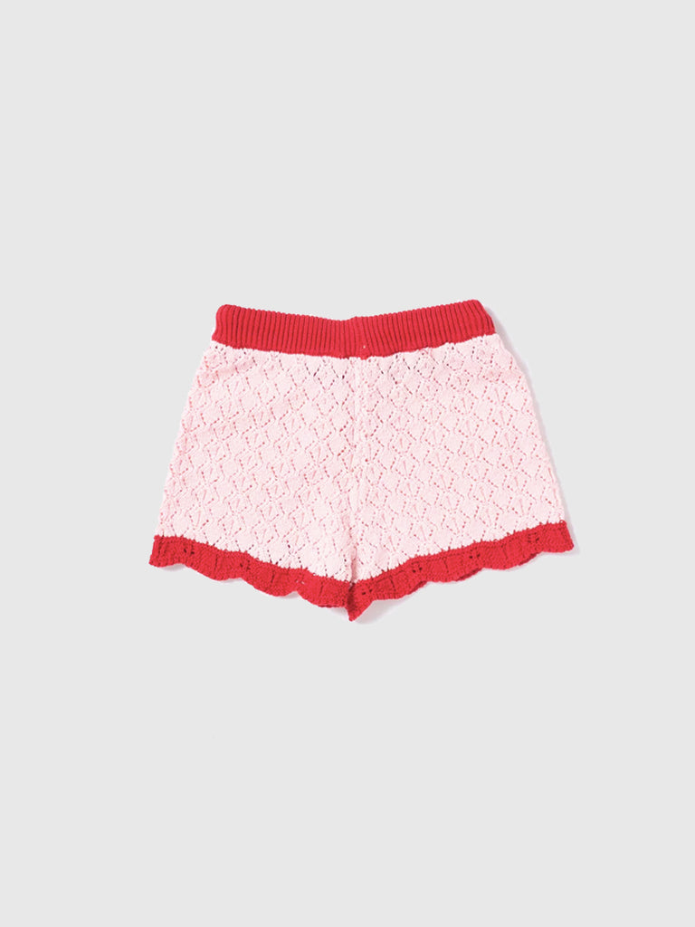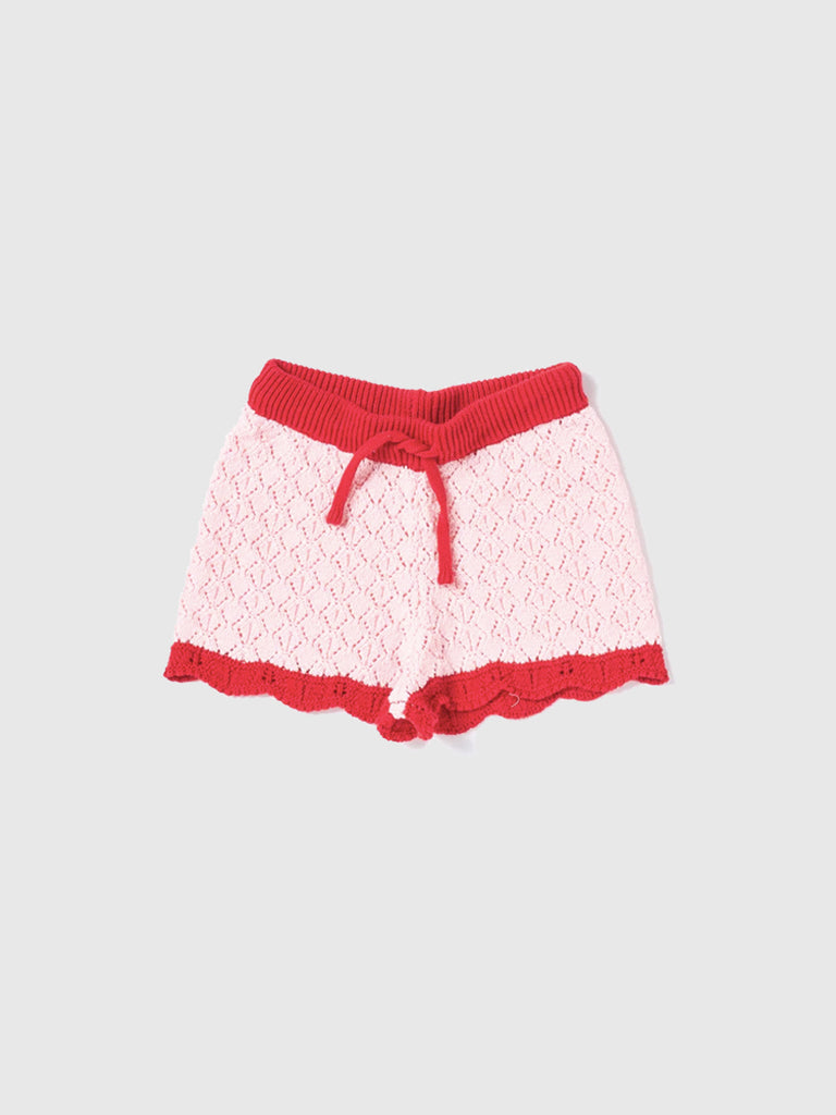 Bright, bold and beautifully nostalgic – the Bella Knit Shorts in Pink & Red are a sweet little statement for summer days. Featuring a delicate pointelle knit in soft blush pink, finished with vibrant cherry red scalloped hems and waistband, these shorts are as comfy as they are cute. Style solo or pair with the matching top for a darling set.