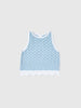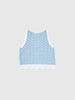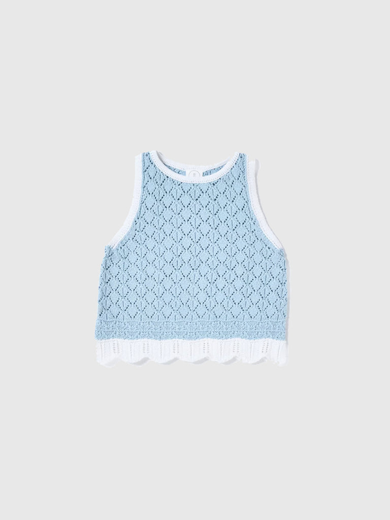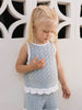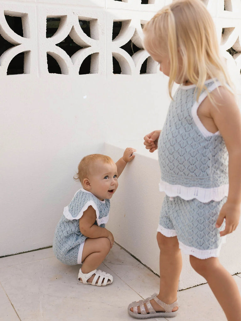 Classic with a playful twist, the Bella Knit Tank in Powder Blue is an heirloom-style piece made for sunshine days. Featuring a delicate pointelle design, soft contrast trims, and a scalloped hem, this sleeveless knit is light, breathable, and full of charm. Style it with the matching Bella Knit Shorts for the ultimate vintage-inspired set.