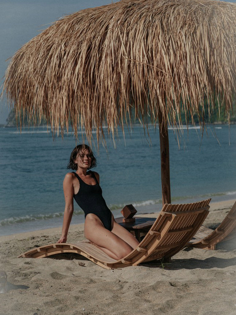 Featuring a round neckline and deep scoop back, it can be worn high or low on the hips to your preference. With thick shoulder straps for ultimate support, it looks great with a sarong, or worn as a bodysuit with shorts and sandals for an effortless resort look.